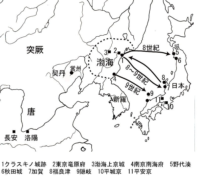 渤海の領域とクラスキノ城跡の位置・日本との航路変遷